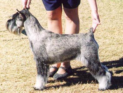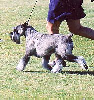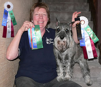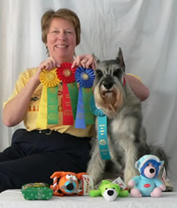 Drum roll please !!!!! On Saturday April 16, 2005 Madison became an AKC Champion . She finished her title with three majors and was shown exclusively from the Bred-By-Exhibitor Class. This is Daddy Aaron's 9th AKC Champion and Mommy YD's 1st AKC Champion. Madison is the FIRST HOME BRED AKC Champion for Himmlisch Standard Schnauzers. We are very proud !