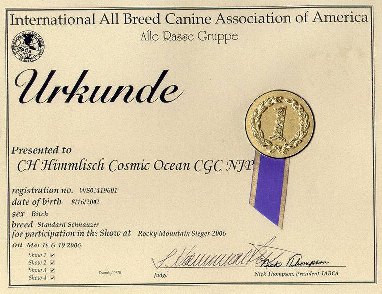 Madison competed for and completed her International Championship title on March 18 and 19, 2006 in Greeley, Colorado from the Zuchter-Adult class (Bred by Exhibitor-Adult). She did this in style obtaining three V-1's (very excellent - top rating for adult class) by three judges of two different countries. Madison went on and earned another V-1 certificate toward her next level of titles. A few of the judges comments included: excellent type and balance, well groomed, excellent presentation, good depth of chest, very good front angulation, great rear angulation and drive, movement strong and level.